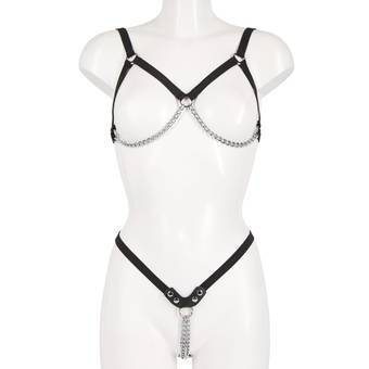 The epitome of “less is more”, this barely-there strappy bikini set shows off your best bits without getting in the way. Frame your twin peaks with dark straps and high-shine chains and enjoy secret thrills from the chain thong that tickles your bits. Leaving your intimate areas completely exposed, this fetish chain bikini gives you the same pleasure of being completely nude, while stimulating your sensitive spots with every subtle movement of the chains. Take full advantage of the durable chains and experiment by attaching cuffs and restrains for added BDSM fun, Fits UK dress size 8 – 14.