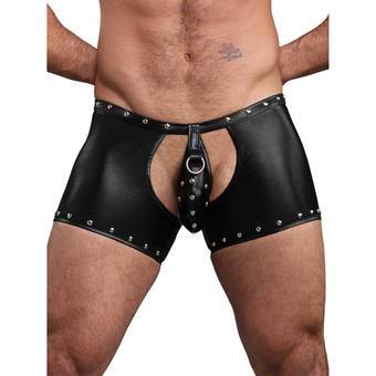 Channel god-like sex appeal in these daringly different chap-style shorts. Not only does the cut-out style give access to your inner thighs and buns, but the central posing pouch can be ripped away to reveal your trident. Poseidon? Pose-eidon, more like. Ideal for clubbing and bedroom wear alike, these sexy Lycra shorts have a subtle wet-look finish and stud detailing to help you stand out in a crowd. The studded posing pouch with a sexy thong back connects to the chap shorts via metal O-rings , with a third O-ring to the centre of the pouch allowing you to easily add restraints, leads, or chains. Simple Velcro-fastening strips mean that the pouch can be easily ripped off, leaving you fully exposed and ready for fun.