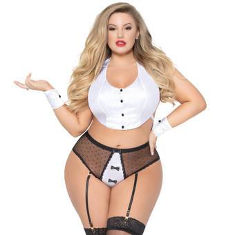 This sexy little tux combo will have your lover shaken and stirred. With a crotchless, cage-back thong, a collared halter top and cuffs to match, it’s perfect for romancing your Bond gal or guy, or for hosting an extremely private cocktail party. Just as sexy at the front, the cage-back thong features a ‘shirt front’ panel and sheer, spotty mesh to tantalise your admirer. Plus, there’s an open crotch to add to the excitement. Aren’t you proud of us that we got to the end without any double entendre about the collar matching the cuffs? (It does, by the way.)
